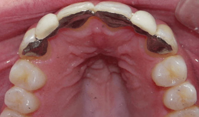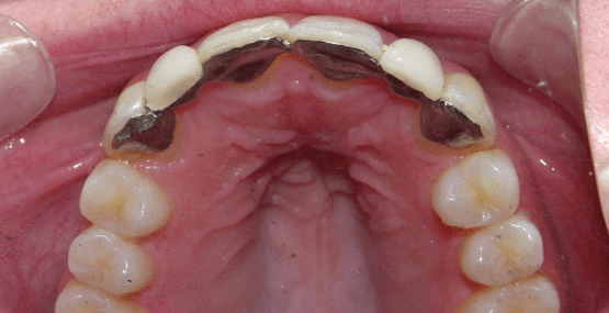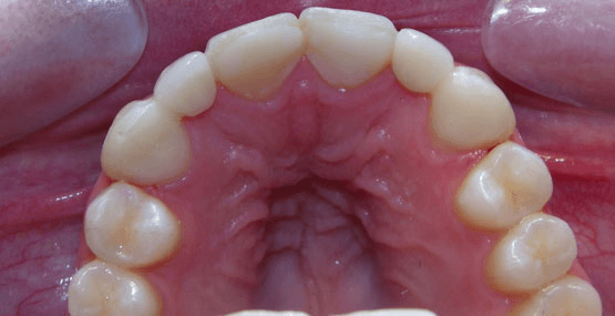 Upper arch with dental appliance visibleUpper dental arch showing palate