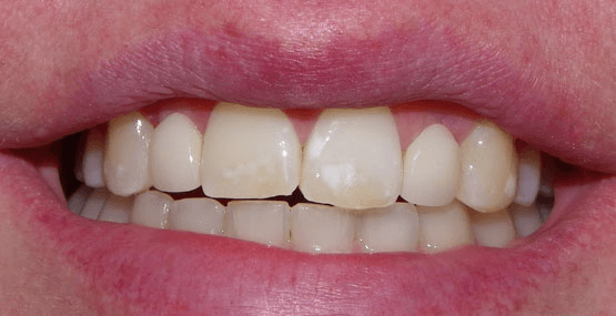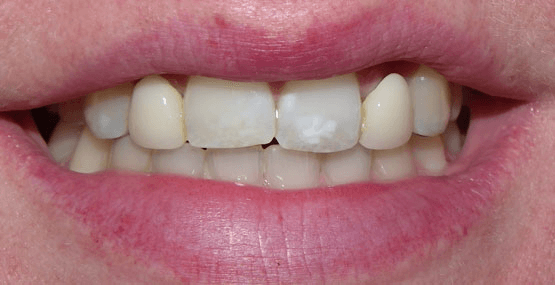 There are situations where implants are not feasible – whether it be due to inadequacies in space, bone, time, or general health – sometimes a bridge is the best treatment. Akin to a bridge on a road where there is a span supported at both ends, a dental bridge involves a prosthetic tooth (or teeth) supported at both ends by natural teeth. Bridges do not come in and out of the mouth, so hygiene around them needs to be strictly maintained. This is a patient who had a terrible-looking Maryland bridge to replace her upper lateral incisors. The greyness of the backing metal wings ended up making her front teeth look dark as well. When one side of the bridge became loose and she jumped at the chance to replace the whole thing.