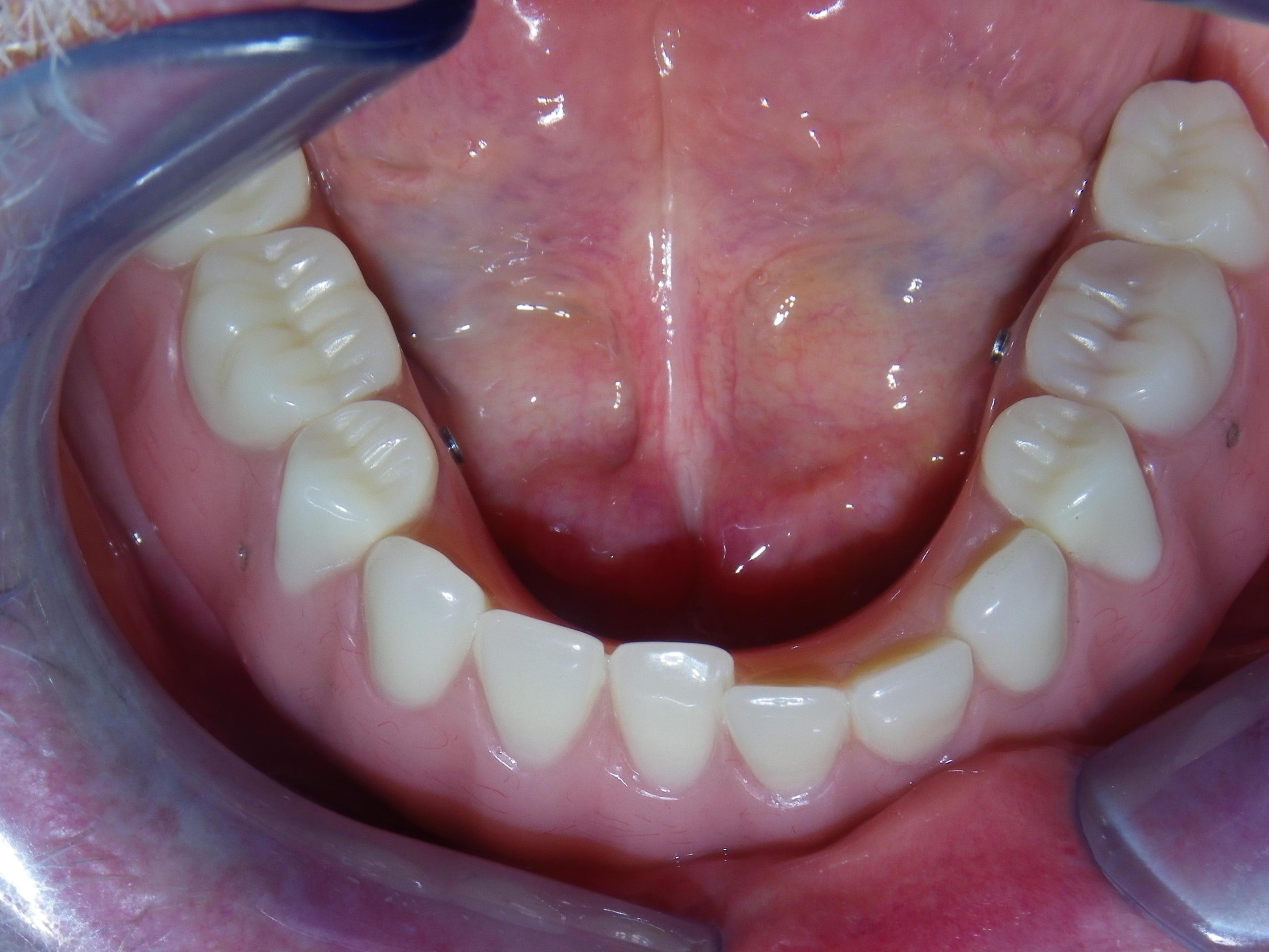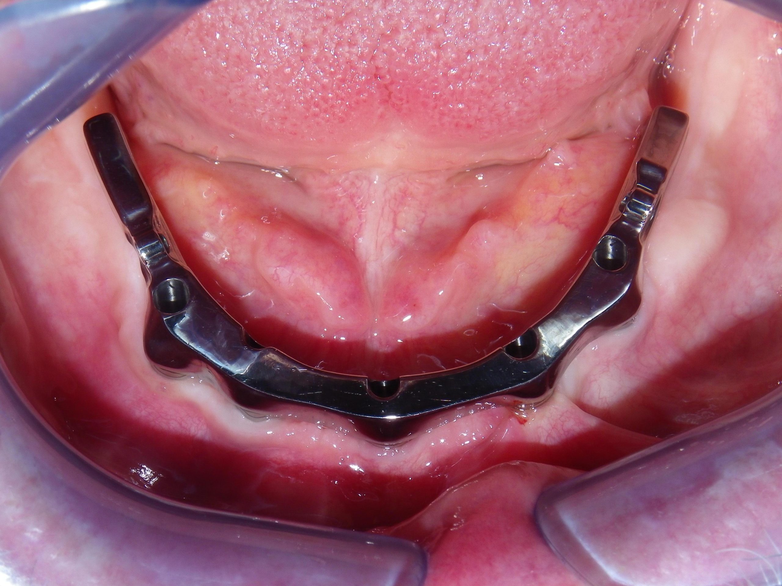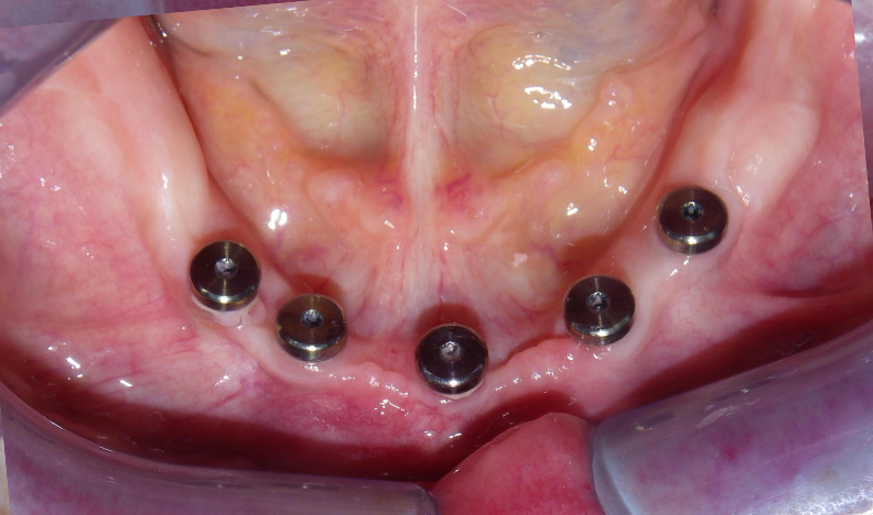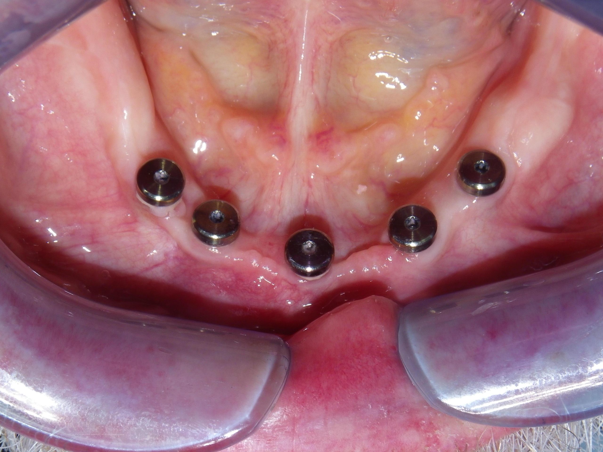 Dental mirror view of tooth surfaceIntraoral view showing implant posts