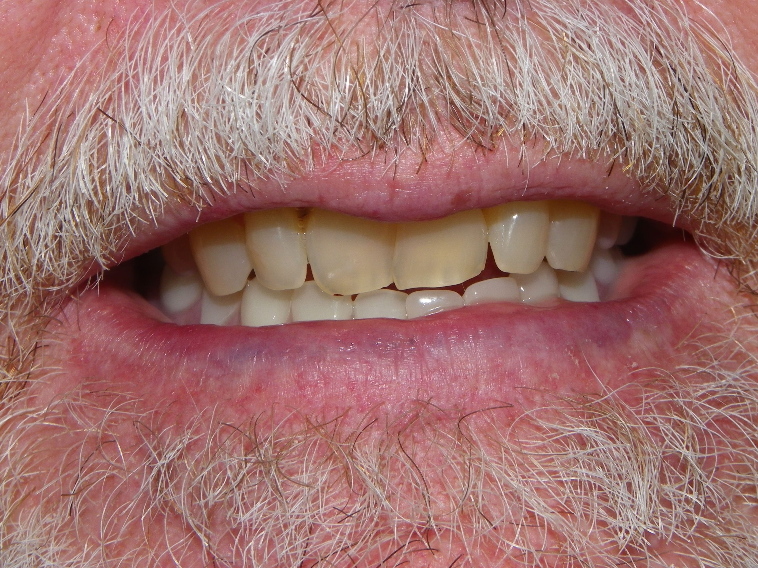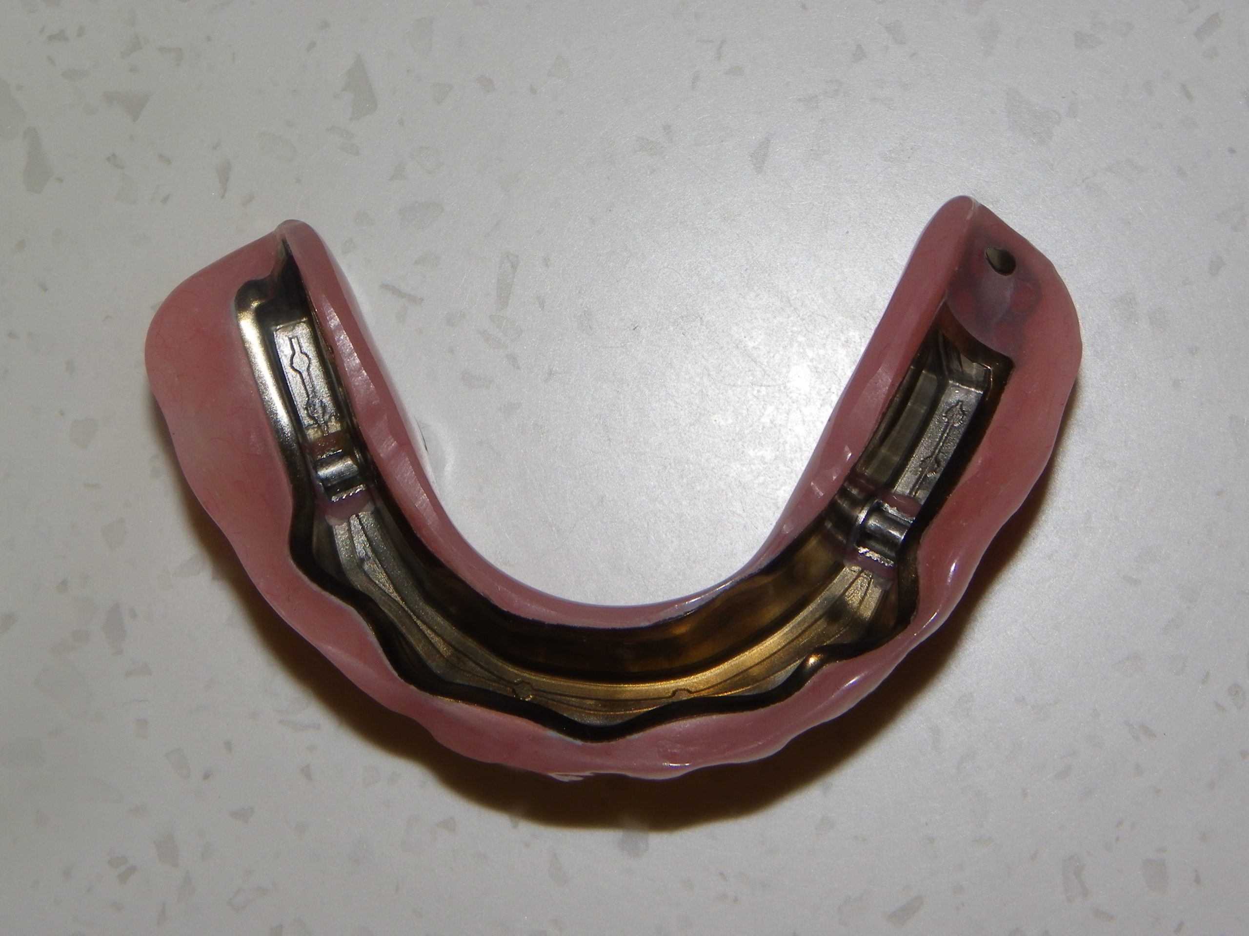 This was achieved by the placement of five lower implants to support a titanium bar.  This bar was then used to support a denture that had a corresponding metal housing and locking pins that engage the bar.  The advantage?  A rigid lower arch that can provide a solid chewing experience while at the same time being easily cleansable by opening the locking pins and removing the denture.  This denture does not come out until the patient removes it himself! (Implants: NobelActive TiUltra 4.3 x 11.5mm in the four posterior sites, NobelActive NP 3.5 x 11.5mm in the middle site, placed by Dr. A Gater of Huronia Oral and Maxillofacial Surgery of Barrie https://maxillocare.com/ , Titanium REBourke bar from Panthera Dental of Quebec City  https://pantheradental.com/ , lab work by Image Dental Laboratories of Barrie https://www.imagedentallaboratory.com/ )